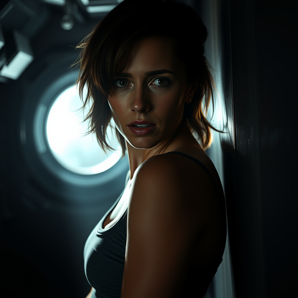 Epic cinematic 8k wallpaper featuring Ellen Ripley from the Alien movie, her expression a mix of resolve and fear. Sheβs clad in a gritty, iconic tank top, captured in a dynamic, half-body shot at a wide angle. Her forehead and cheeks glisten with sweat as she presses her back against the wall of the Nostromo space shuttle. Set in a shadowy room, the scene is steeped in sci-fi aesthetics, with precise ray tracing creating a dramatic rim light. Ultra-detailed and embodying cinematic flair, the composition is centered, exuding a stoic, moody atmosphere. The high contrast of Rembrandt lighting highlights her features, enhanced by ambient and lumen reflections. The shallow focus and rtx ray tracing lighting lend an ultra-realistic quality, akin to an octane render, presented in stunning 8K resolution.