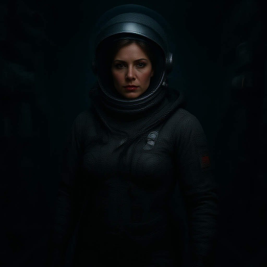 Epic cinematic 8k wallpaper featuring Ellen Ripley from the Alien movie series, her expression resolute and determined. Clad in an intricately designed astronaut space suit with her helmet on, she stands in the shadowy corner of the Nostromo shuttle. Her beautifully symmetrical face is highlighted by the subtle interplay of light and shadow. The scene captures the haunting and futuristic interiors of the spaceship, enhanced by sci-fi elements with exceptional detail. Utilizing ray tracing and overcast reflection mapping, the setting appears incredibly lifelike and cinematic, akin to high-quality promotional art. The ultra-realistic imagery, reminiscent of a shot captured on a Canon 5D with redshift rendering, leverages movie-quality VFX and RTX ray tracing lighting to deliver unmatched detail and realism in 8K resolution.