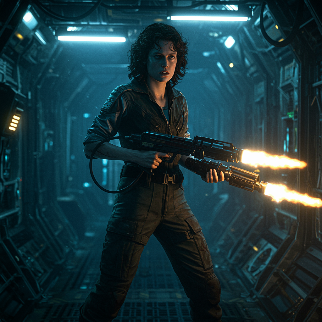 Epic cinematic 8k wallpaper featuring Ellen Ripley in an iconic action pose reminiscent of the Alien movie, set in a dark, atmospheric spacecraft interior. Her determined expression is highlighted by dramatic lighting that casts striking shadows. Ripley is armed with her signature flamethrower, and the eerie glow of emergency lights flickers in the background, creating a tense, otherworldly ambiance. The scene captures the raw intensity and resilience of her character, with subtle creative details such as futuristic suit enhancements and faint hints of an alien silhouette lurking in the shadows, enhancing the sense of imminent danger.