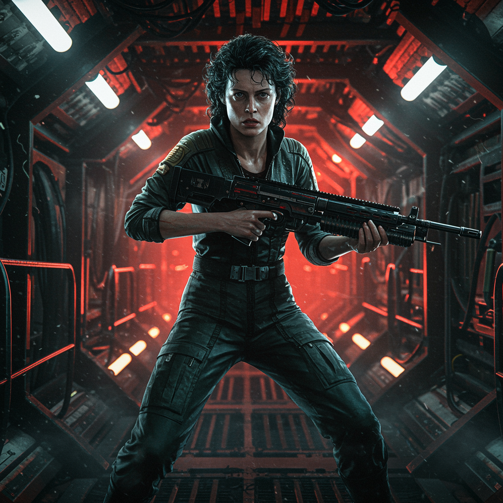 Epic cinematic 8k wallpaper of a fierce Ellen Ripley in a dynamic action pose, set in the dimly lit futuristic corridors of a spaceship. Her intense gaze and determined expression are highlighted by the eerie glow of flashing red emergency lights. Ripley is clad in a slightly modified version of her iconic space jumpsuit, with subtle futuristic enhancements. She's gripping a sleek, high-tech pulse rifle, ready to confront any lurking threats. Shadows and smoke add to the dramatic atmosphere, while the intricate details of the spaceship's metallic textures gleam under the flickering lights.