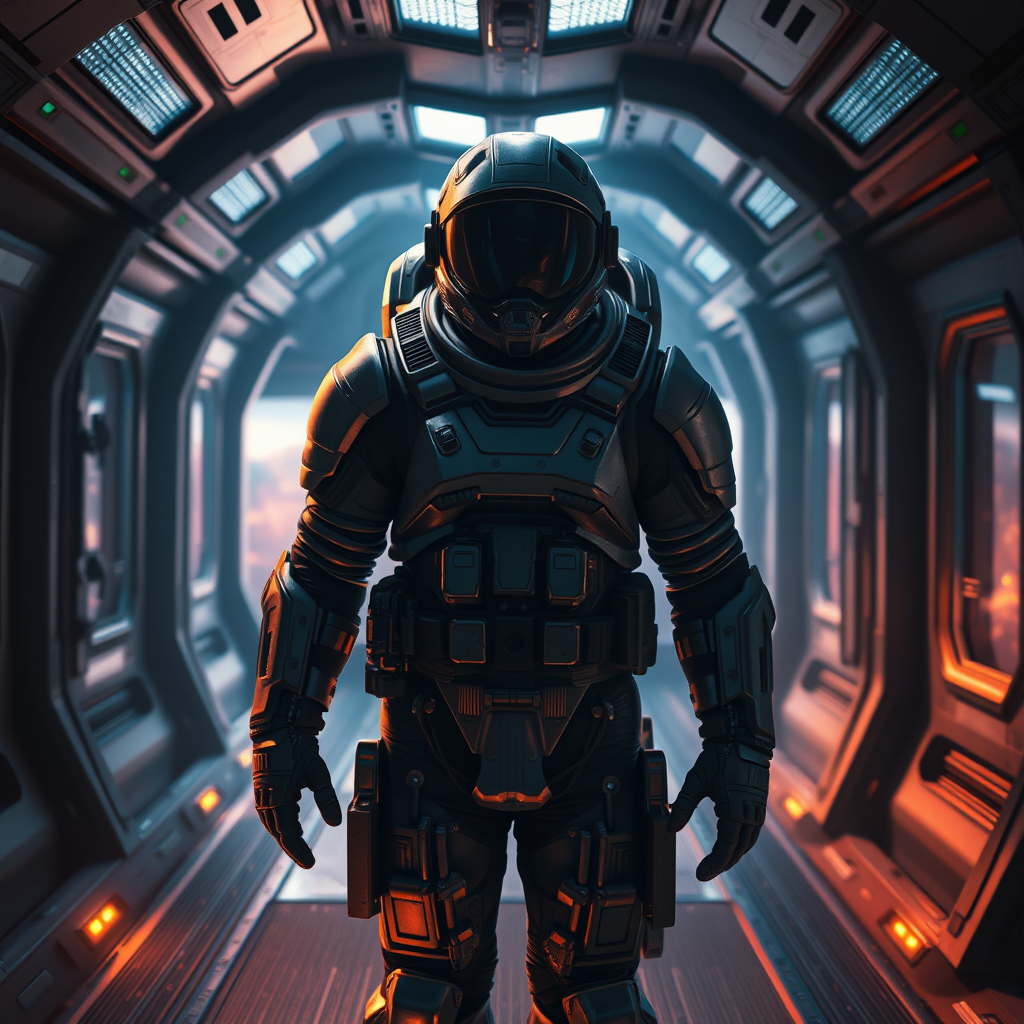 Epic cinematic 8k wallpaper of a fierce space explorer in futuristic armor standing in a dimly lit spaceship corridor, atmospheric lighting casting dramatic shadows, intricate details on the spacesuit, vibrant celestial background visible through distant windows, capturing the essence of resilience and determination, ultra-realistic octane render, 8K resolution.