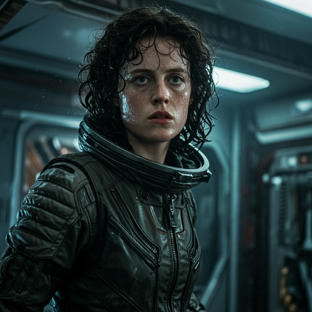 Epic cinematic 8k wallpaper of Ellen Ripley, face determined and focused, from the Alien movie, astronaut clad in a beautifully detailed and ornate space suit, beads of sweat glistening on her cheeks and forehead, showcasing a strikingly symmetrical face, standing in a dynamic action pose within the Nostromo spaceship interiors, sci-fi ambiance, enhanced by Ray Tracing technology, showcasing ultra detailed and high-quality realism, embodying the essence of promotional art. The scene is illuminated with overcast reflection mapping, achieving photorealism that rivals cinematic movie standards, featuring VFX post-production excellence, utilizing RTX ray tracing lighting for ultra realism, captured as if shot on a Canon 5D, in stunning 8K resolution.