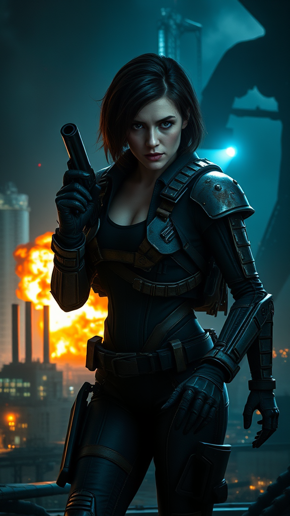 Epic cinematic 8k wallpaper of Ellen Ripley from Alien movie in intense combat stance, surrounded by dark and ominous alien spacecraft shadows, with a laser scarित on her cheek and a power loader exosuit adorned with damaged plates and rust stains, backlit by a fiery explosion in the background, with a cityscape of Fiorina 161 in the foreground, where the dimly lit twin refineries loom in the distance, with Ripley's determined expression illuminated by a faint blue glow of her split-circuit flamethrower on the wall behind her