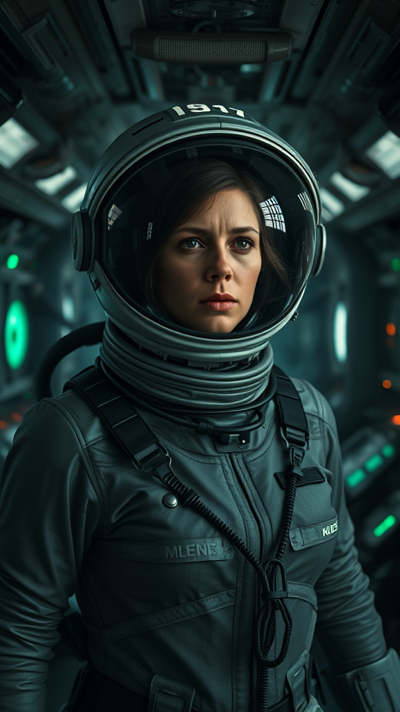 epic cinematic 8k wallpaper of Ellen Ripley from Alien movie, astronaut in full space suit, helmet on with visor reflecting the dim Nostromo interiors; standing amidst intricate control panels and atmospheric corridors bathed in low, moody lighting; photorealistic, capturing filmic essence with enhanced vfx post production; rtx ray tracing providing dynamic, realistic shadows and highlights; ultra-detailed textures, crisp hd, hdr quality; shot as if on a vintage mitchell bnc camera, rendered with octane for a hyper-realistic 8k experience; subtle added details evoke a sense of cosmic isolation and suspense.