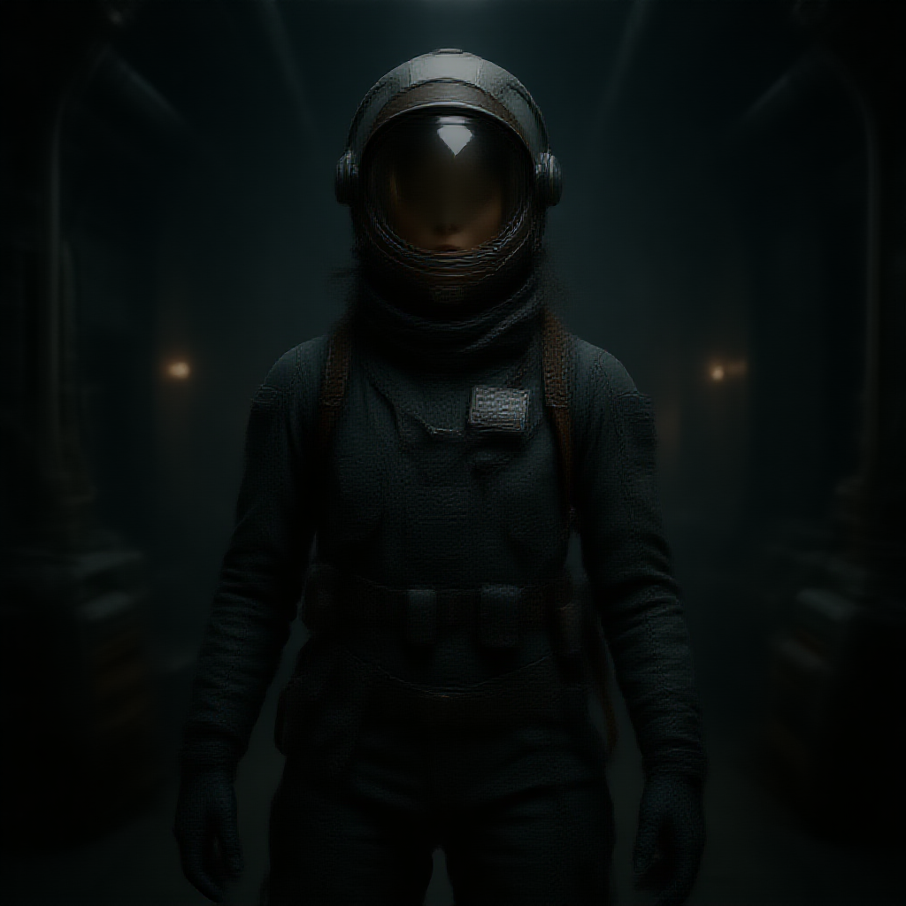 Epic cinematic 8k wallpaper of Ellen Ripley from Alien movie, astronaut with helmet on, visor closed, standing in the atmospheric and detailed interiors of the Nostromo space shuttle, photorealistic and cinematic with movie quality, enhanced through vfx post production, featuring advanced rtx ray tracing lighting that adds depth and realism, ultra-realistic with hyper-detailed textures, high-definition, hdr, 4k, 8k resolution, captured with a Mitchell BNC camera look, rendered using octane for a vivid and lifelike presence, subtly intensified with creative environmental lighting effects and atmospheric elements.