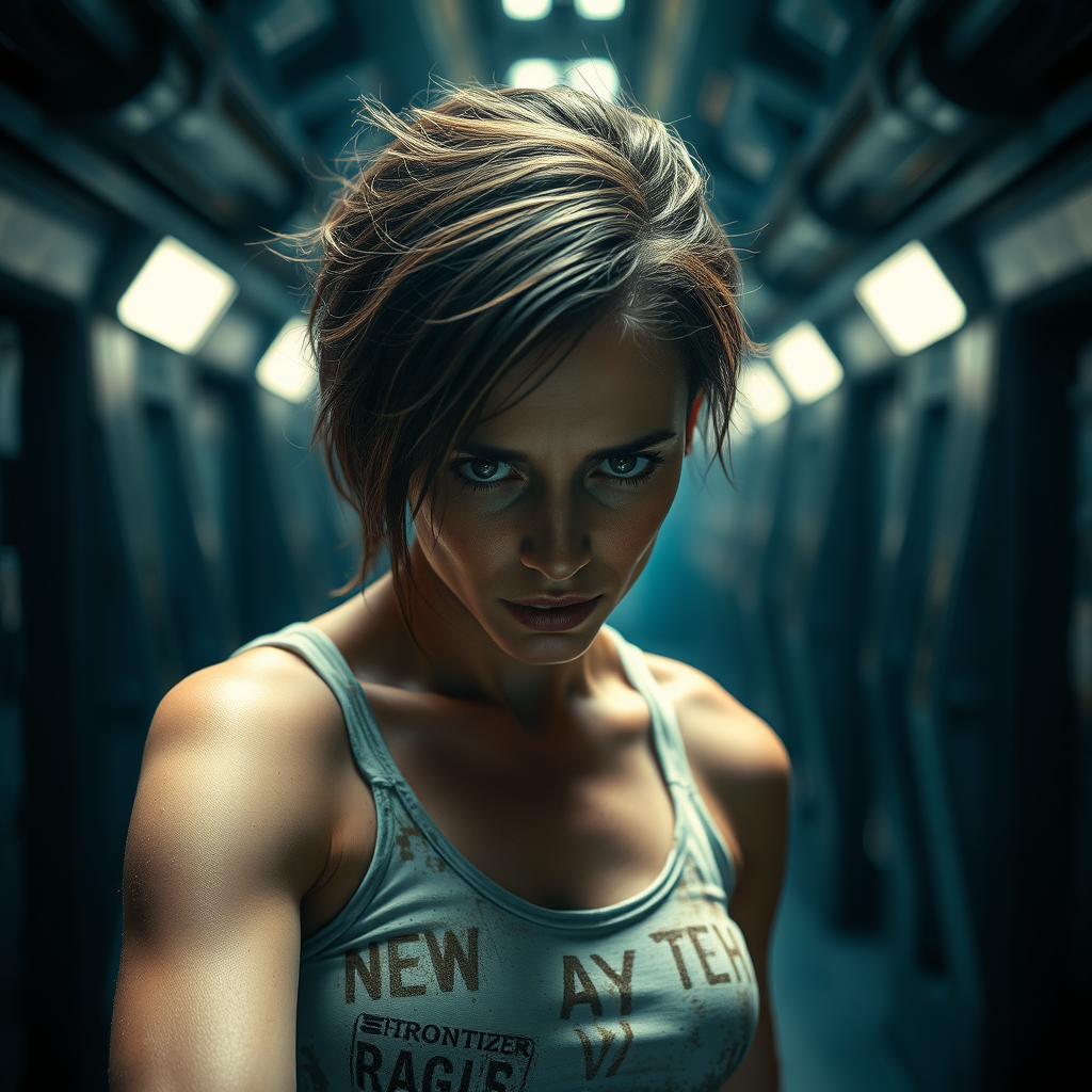 Epic cinematic 8k wallpaper of Ellen Ripley from the Alien movie, her expression determined and intense. She's clad in a tattered, grimy white tank top, set in a dynamic half-body action pose. Her forehead and cheeks glisten with sweat, capturing a photorealistic and cinematic essence. The image boasts VFX post-production, enhanced by RTX ray tracing lighting. Ultra-realistic and hyper-detailed, it achieves HD, HDR, 4k, and 8k fidelity. Shot on a Mitchell BNC camera with Octane render, the scene captures subtle background elements of a dimly lit, high-tech corridor, adding depth and atmosphere while maintaining focus on Ripley's commanding presence.