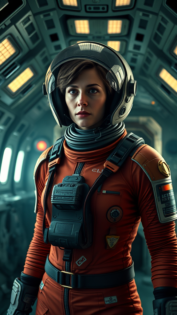 Epic cinematic 8k wallpaper of Ellen Ripley from the Alien movie, wearing a detailed astronaut suit with the helmet on and visor closed, standing confidently in the eerie and atmospheric interiors of the Nostromo space shuttle, infused with photorealistic and cinematic movie quality. The scene is enhanced with VFX post-production and RTX ray tracing lighting to create a dramatic, ultra-realistic atmosphere. The hyper-detailed visuals are captured in HD, HDR, and stunning 8k resolution, as if shot on a legendary Mitchell BNC camera. Rendered with Octane for unparalleled realism and depth, the image showcases Ripley's determined expression and the intricate details of the shuttle environment.