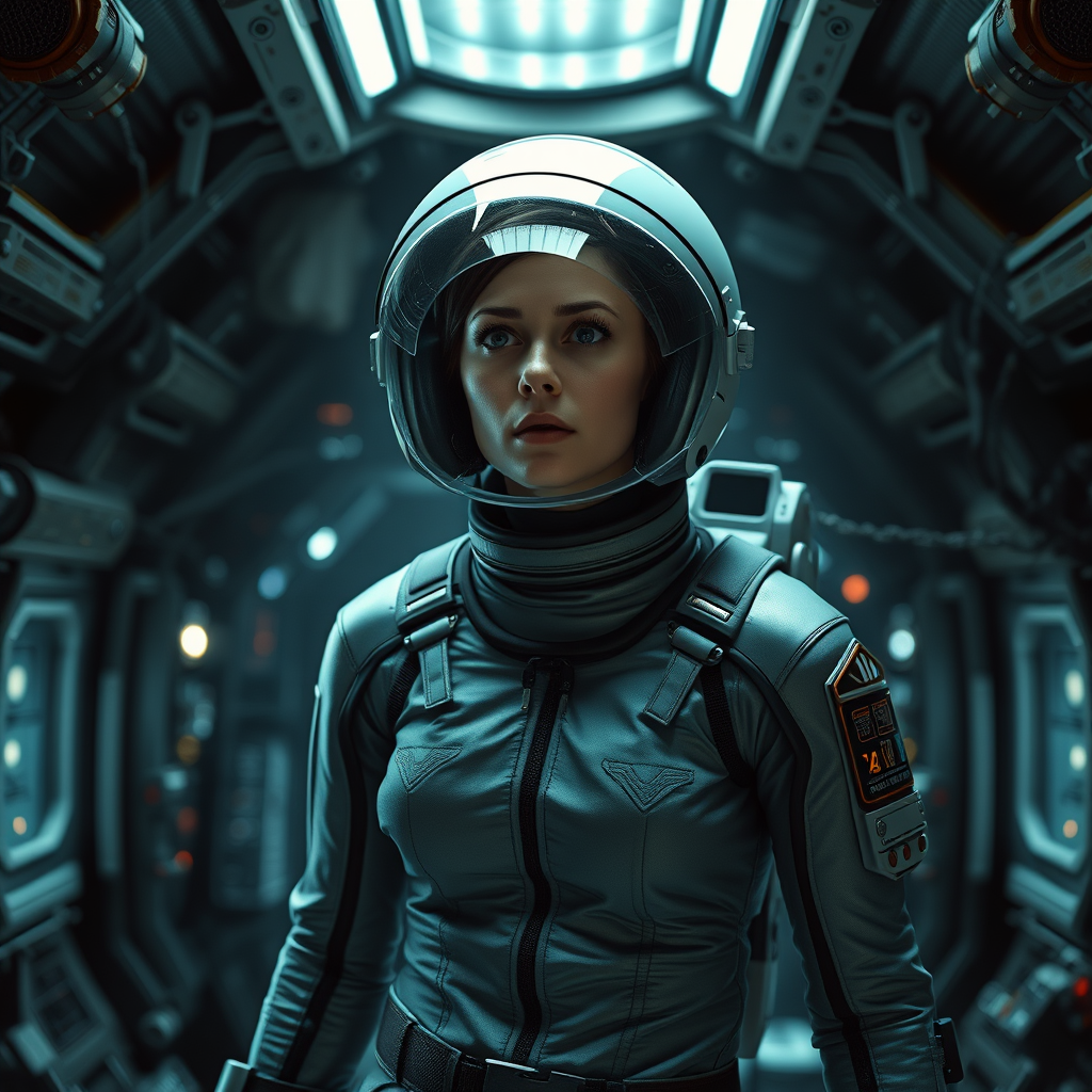 Epic cinematic 8k wallpaper of Ellen Ripley, from the Alien movie, wearing a sleek astronaut suit with helmet on and visor down, standing amidst the intricate and dimly-lit interiors of the Nostromo spacecraft, photorealistic and cinematic in essence, showcasing movie-quality visuals with meticulous VFX post-production, enhanced by advanced RTX ray tracing for dynamic lighting, ultra-realistic and hyper-detailed in every aspect, rendered in stunning HD, HDR, 4K, and 8K resolution, capturing the scene as though shot on a Mitchell BNC camera using Octane Render, maintaining an intense and immersive sci-fi atmosphere.
