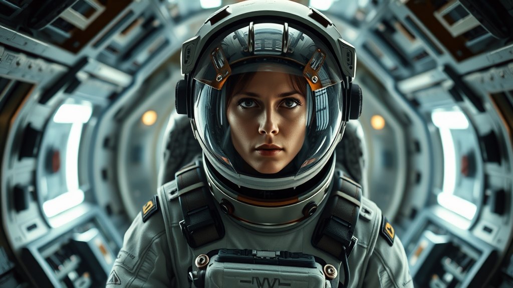 Epic cinematic 8k wallpaper of Ellen Ripley from the Alien movie, astronaut in advanced space suit, helmet on, visor closed, standing confidently in the Nostromo space shuttle interiors, photorealistic, cinematic, movie-quality, enhanced with VFX post-production, RTX ray-tracing lighting creating dynamic shadows, ultra-realistic, hyper-detailed textures, stunning HD and HDR effects, rendered in breathtaking 4k and 8k resolution, captured with the precision of a Mitchell BNC camera, enhanced by an Octane render engine, evoking a sense of tension and adventure in deep space.