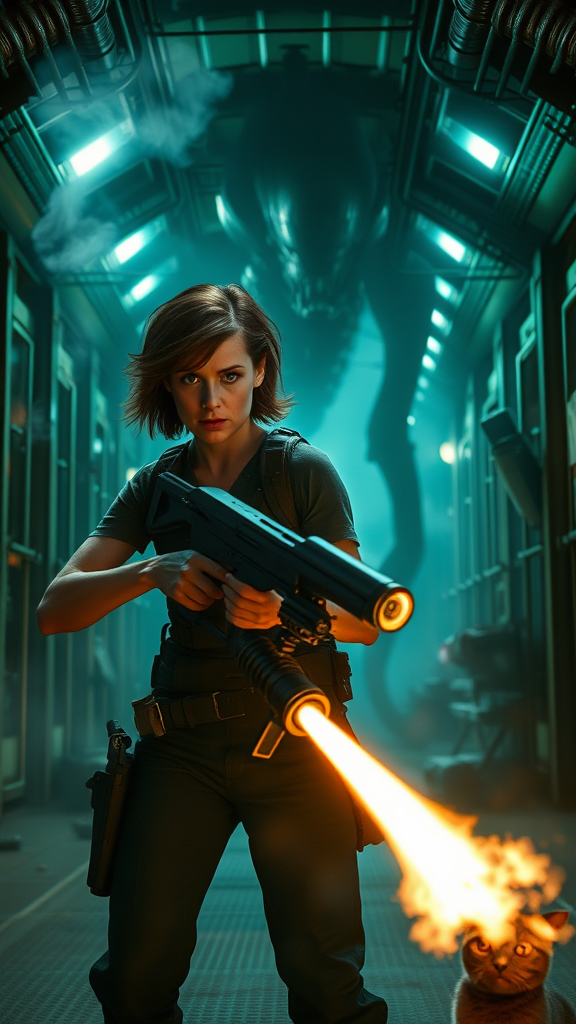 Epic cinematic 8k wallpaper of Ellen Ripley from the Alien movie, depicted in a dynamic action pose, standing confidently amidst a dimly lit, industrial spaceship corridor with steam wafting from the vents; her eyes are fierce and determined, clutching a futuristic flame thrower at the ready; the ominous shadow of an alien creature looms in the background, adding tension and drama to the scene; Ripley's trusty cat, Jonesy, is perched nearby, peering cautiously into the darkness; the scene is cast in moody, atmospheric lighting with hints of green and blue hues, enhancing the suspense and otherworldly environment.
