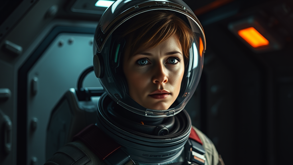 Epic cinematic 8k wallpaper of Ellen Ripley from the Alien movie, her face resolute and determined. She wears an intricately detailed astronaut space suit with a clear helmet, showcasing her beautifully symmetrical face. Ripley stands in a shadowy corner of the Nostromo spaceship interiors, captured in an ultra-realistic sci-fi scene. The setting is enhanced by advanced ray tracing and overcast reflection mapping, delivering an ultra-detailed, photorealistic look. Designed as high-quality promotional art, the cinematic feel is complemented by movie-quality VFX post-production techniques and atmospheric RTX lighting. Captured as if shot on a Canon 5D with Redshift rendering, this image is rendered at 8K for vivid realism and depth.