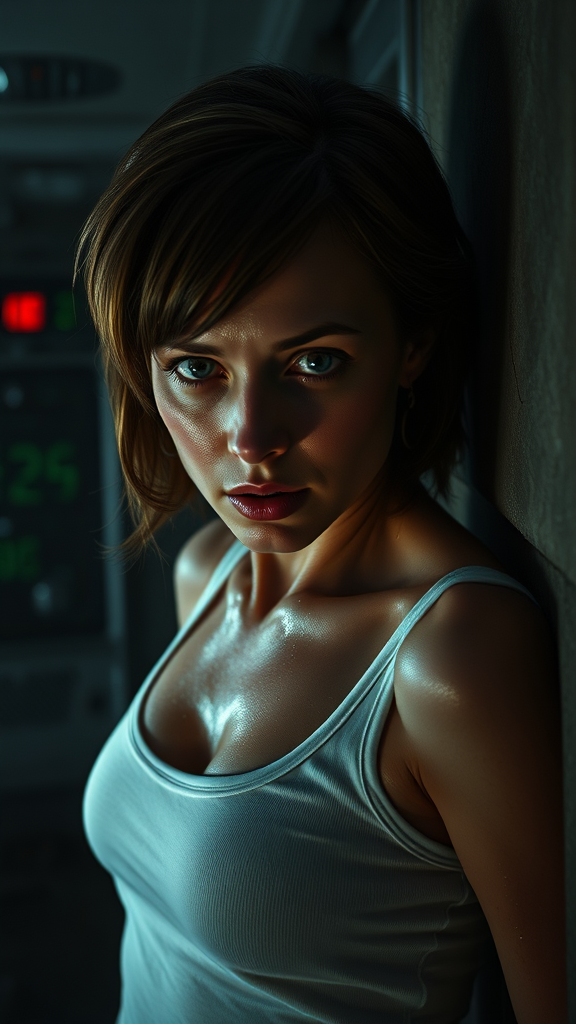 Epic cinematic 8k wallpaper of Ellen Ripley from the Alien movie, her face resolute yet filled with fear. She's clad in a white tank top, captured in a wide angle, action-packed half-body shot. Sweat glistens on her forehead and cheeks, depicted in a close-up, centered composition as she presses her back against the wall of the Nostromo space shuttle. The scene takes place in a dimly-lit room with a sci-fi atmosphere. Ray-traced rim lighting and ultra-detailed visuals bring forth a movie-quality aesthetic. It's a stoic, cinematic shot with a dark and moody ambiance, enhanced by lumen reflections and subtle ambient lighting. The composition features high contrast and a shallow focus, utilizing RTX ray tracing for ultra-realistic octane-rendered visuals. The lighting mirrors Rembrandt's style, creating a vogue-like quality in stunning 8K resolution.