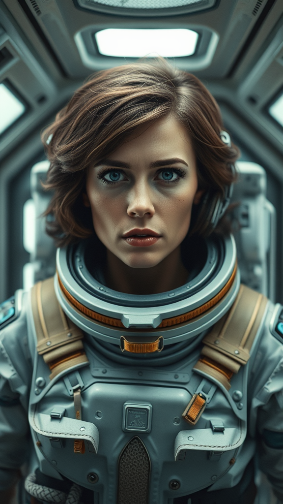 Epic cinematic 8k wallpaper of Ellen Ripley, her expression resolute, inspired by the Alien movie, wearing a detailed and ornate astronaut space suit, with subtle sweat on her cheeks and forehead, showcasing a beautifully symmetrical face, depicted in an action stance within the Nostromo space shuttle interiors. This scene embodies sci-fi elements with Ray Tracing, characterized by ultra detail, photorealism, and the highest quality, as if designed for promotional art. The atmosphere features overcast reflection mapping, cinematic movie quality, enhanced by VFX post-production, RTX ray tracing lighting, captured in ultra-realistic detail, reminiscent of a shot taken on a Canon 5D in 8K resolution.