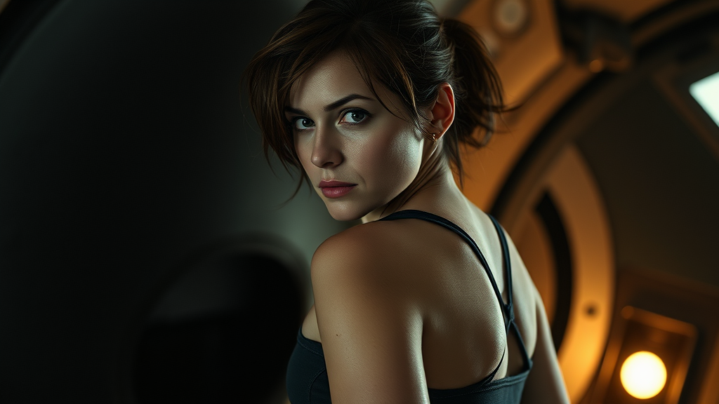 Epic cinematic 8k wallpaper of Ellen Ripley, her face a mixture of resolve and fear, from the iconic Alien movie. She is wearing a sleeveless tank, captured in a wide-angle, dynamic action pose, half-body shot. Her forehead and cheeks glisten with sweat. In this centered composition, her back is pressed against the textured wall of the Nostromo space shuttle, standing in a shadowy, sci-fi room. The scene features exquisite ray tracing, with rim light accentuating her features. The image is ultra-detailed, boasting the highest quality, reminiscent of a cinematic movie shot. It exudes a stoic yet dramatic mood, enhanced by the dark, ambient lumen reflections and atmospheric lighting. The composition uses Rembrandt lighting for high contrast and shallow focus, showcasing ultra-realistic detail with the power of octane render. An 8K resolution encapsulates this intense, vogue-style visual, producing a masterpiece of ultra-realism and dramatic flair.
