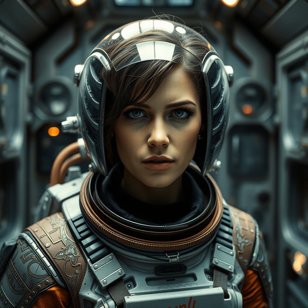 Epic cinematic 8k wallpaper of Ellen Ripley, her face determined and focused, from the Alien movie. Astronaut clad in an ornate and intricately designed space suit, glistening sweat on her cheeks and forehead, her face beautifully symmetrical. Standing in a dynamic pose within the Nostromo space shuttle interiors, enveloped in a sci-fi atmosphere. Ultra detailed and photo-realistic with cinematic movie quality, enhanced by Ray Tracing and VFX post-production techniques. Overcast reflection mapping adds depth, capturing the essence of a high-stakes moment. Shot in ultra-realistic resolution on a Canon 5D, capturing every nuance in 8K quality.