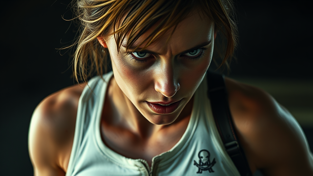 Epic cinematic 8k wallpaper of Ellen Ripley, her face resolute and intense, from the Alien movie, clad in a distressed and dirt-streaked white tank top. The scene captures her in a dynamic action pose, a half-body shot showcasing her determination. Her forehead and cheeks glisten with sweat, emphasizing the stress of the moment. The composition is close-up and photorealistic, with cinematic quality, enhanced by VFX post-production and RTX ray tracing lighting. It is ultra-realistic and hyper-detailed, shot in 4K and 8K resolution using a Mitchell BNC camera, rendered in Octane for maximum clarity and depth. The atmosphere is tense yet compelling, with shadows expertly playing across her features, capturing the essence of a sci-fi action hero in vibrant detail.