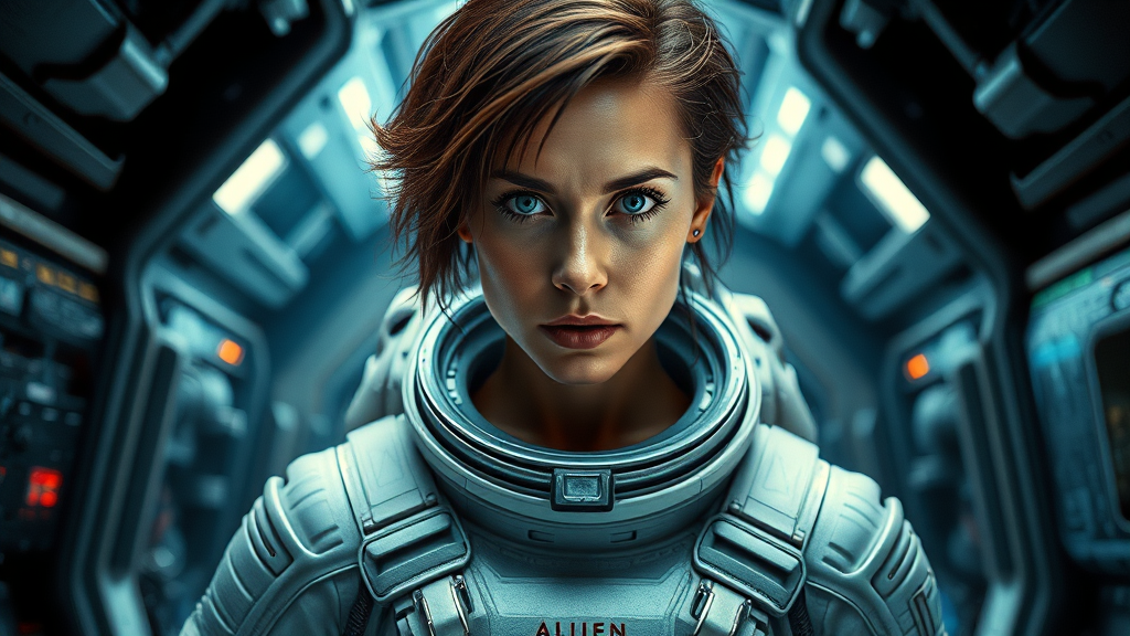 Epic cinematic 8k wallpaper of Ellen Ripley, her face determined and intense, from the Alien movie, dressed in an elaborate and intricate space suit, sweat glistening on her cheeks and forehead, showcasing a beautifully symmetrical face. She stands in a dynamic action pose within the Nostromo space shuttle interiors, exuding a sci-fi aura, captured with ray tracing technology, ultra-detailed and of the highest detail quality. This ultra-realistic portrayal serves as promotional art, featuring overcast reflection mapping, photorealistic depth, cinematic flair, and movie-quality VFX post-production. Shot with Canon 5D in 8K, the lighting highlights RTX ray tracing for an ultra-realistic finish.