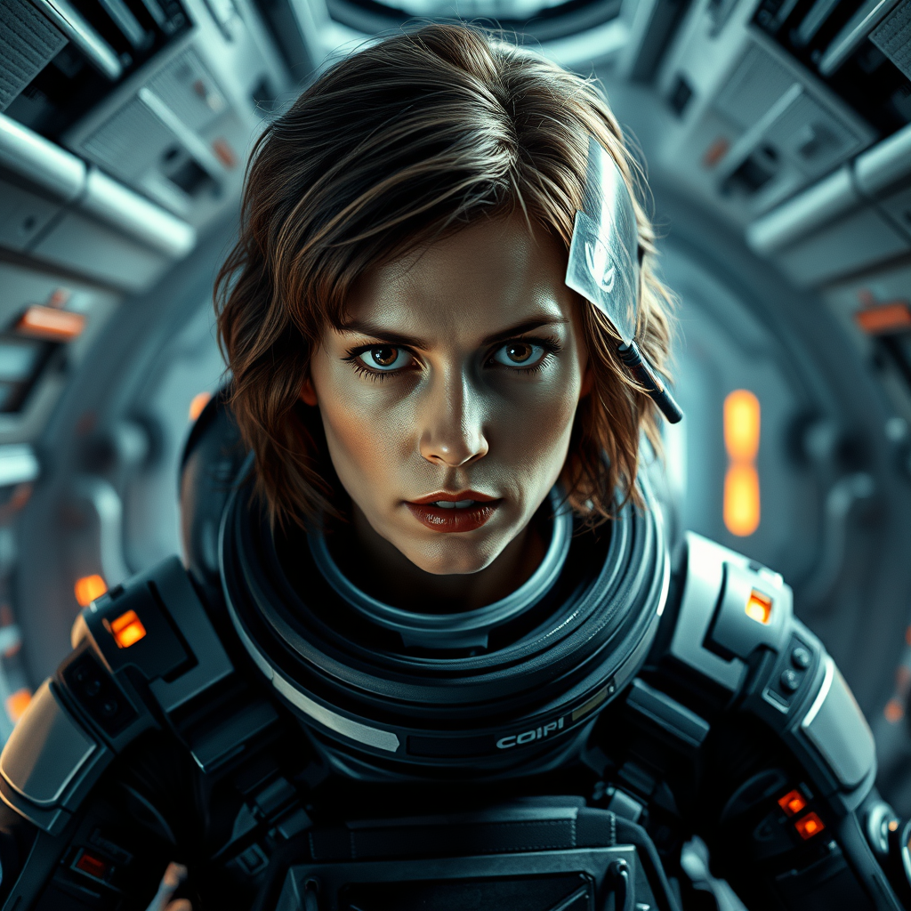 Epic cinematic 8k wallpaper of Ellen Ripley with a determined expression from the Alien movie, donning a futuristic and detailed space suit, beads of sweat upon her cheeks and forehead, showcasing her strikingly symmetrical face, portrayed in a bold action stance within the Nostromo space shuttle interiors. The scene is enriched with sci-fi elements, utilizing ray tracing for an ultra-detailed and hyper-realistic finish, akin to top-tier promotional art. Overcast reflective mapping enhances the photorealistic quality, akin to cinematic movie production, featuring VFX post-production techniques and RTX ray tracing lighting. Captured in stunning ultra-realistic detail as though shot on a Canon 5D, in 8K resolution, embodying an immersive, high-quality movie aesthetic.