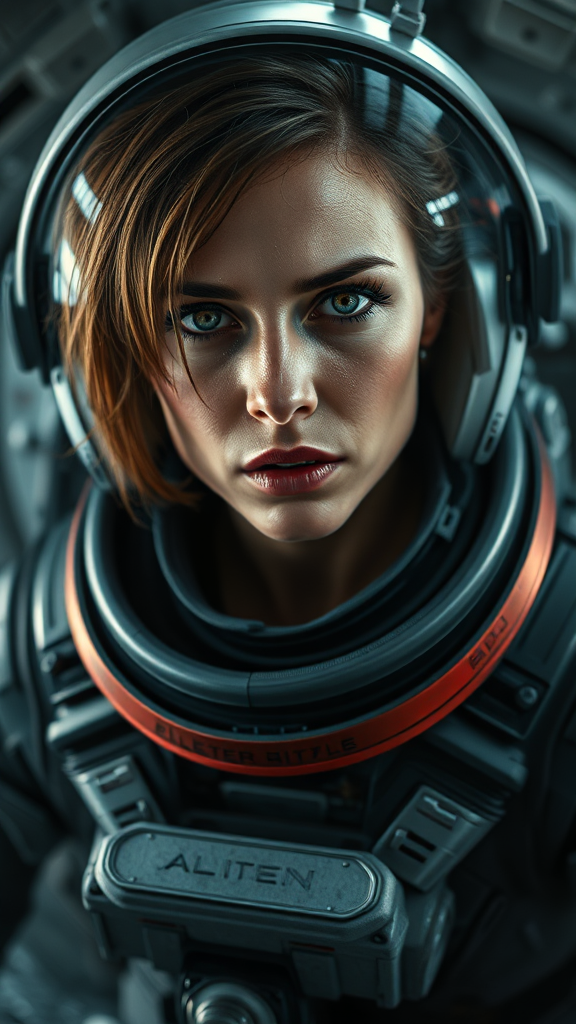 Epic cinematic 8k wallpaper of Ellen Ripley with a determined expression, inspired by the Alien movie, featuring an astronaut in a detailed and ornate space suit, sweat glistening on her cheeks and forehead, showcasing her beautiful symmetrical face. She's poised in an action stance within the interiors of the Nostromo space shuttle. The scene is sci-fi with ray tracing, ultra-detailed, ultra-realistic, akin to promotional art. Reflective lighting creates an overcast ambiance, the photorealistic quality akin to movie production, with VFX post-production and RTX ray tracing lighting, shot with the precision of a Canon 5D in 8K resolution.