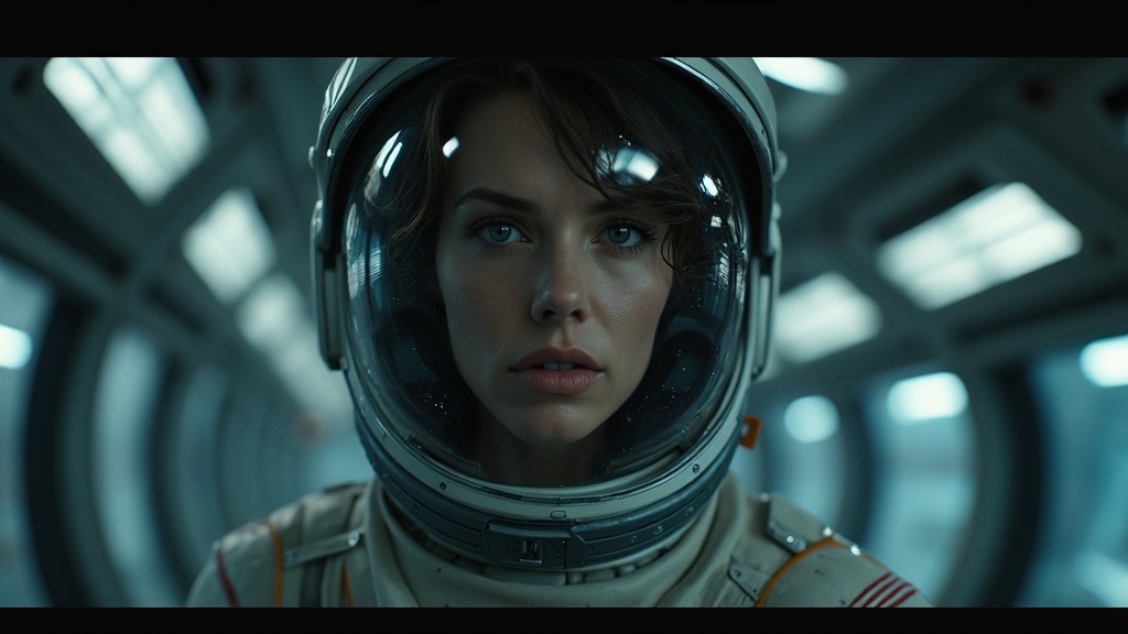 Epic cinematic 8k wallpaper of Ellen Ripley from the Alien movie, featuring her as a resolute astronaut with the helmet on and visor closed, standing in the Nostromo space shuttle interiors. The scene is photorealistic with cinematic movie quality enhanced by cutting-edge VFX post-production and RTX ray tracing lighting. It offers ultra-realism with hyper-detailed visuals in HD, HDR, 4k, and 8k resolution, capturing a dramatic moment as if shot on a Mitchell BNC camera with Octane render. The atmosphere is further enriched by a subtle reflection of distant stars visible on her visor, hinting at the vastness of space outside.