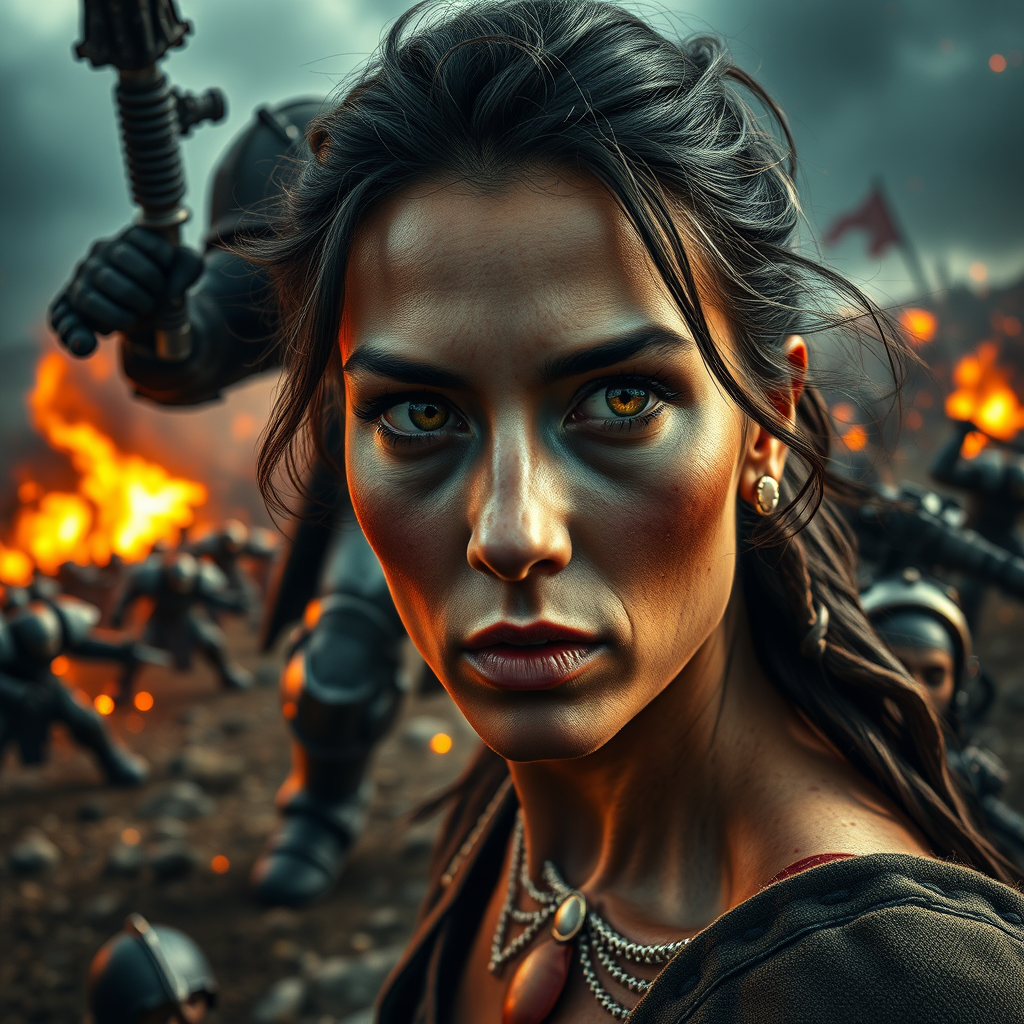 Epic cinematic scene of a Space Wolves Space Marine in intense battle with Orcs on a vast battlefield. The action is dynamic and dramatic, with striking lighting that highlights the intricate details of the scene. The image is vividly realistic, showcasing a masterful depiction in sharp focus, with an 8k UHD HDR quality that captures the raw essence of cinema. In the foreground, a woman with textured skin and remarkably detailed pupils stands, captured with the precision of a studio's cinematic camera, giving the image a candid and authentic feel akin to 16mm film. The scene is a harmonious blend of realism and artistic detail, creating a captivating visual narrative.