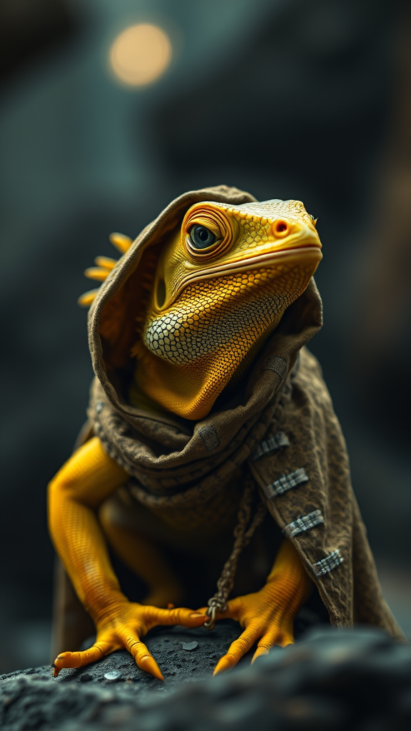 Epic cinematic still of a charming yellow iguana in a weathered cultist cloak, full body shot. Captured with a shallow depth of field for a striking vignette effect, the scene is rich in detail and high budget allure. Bokeh sparkles in the background, enhancing the cinemascope framing. The mood is both mysterious and majestic, with a gorgeous grainy texture evoking classic film noir.