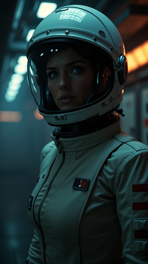 View this AI-generated image featuring epic cinematic 8k wallpaper of ellen ripley from the alien movie wearing an iconic astronaut suit with the helmet on and visor closed poised in the atmospheric and dimly lit interiors of the nostromo space shuttle the scene is photorealistic with cinematic movi
