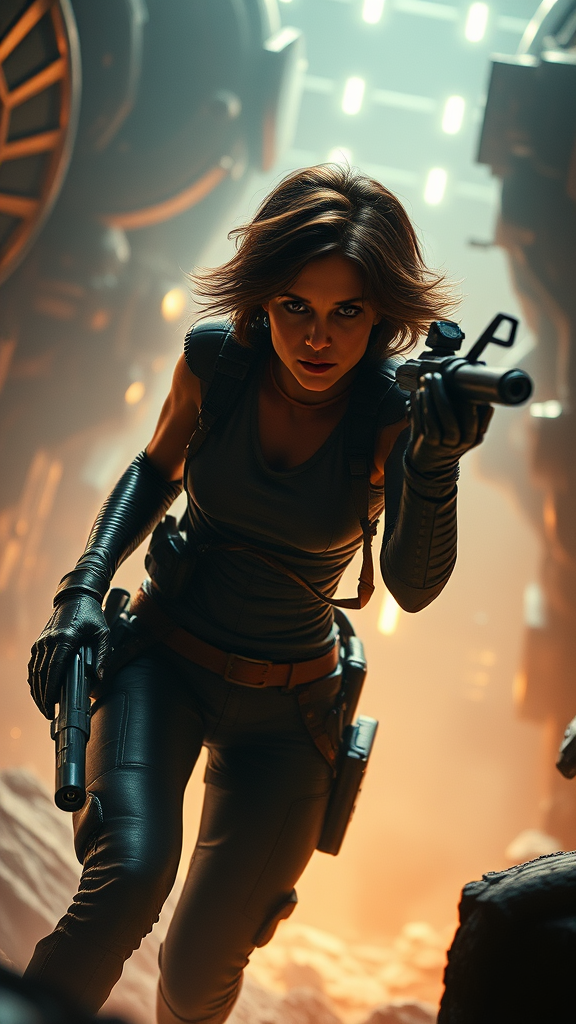 Epic cinematic wallpaper featuring Ellen Ripley in a dynamic action pose, set against a dramatic sci-fi backdrop with intricate details and atmospheric lighting, rendered in breathtaking 8K resolution, showcasing a subtle play of shadows and light reflecting off her futuristic gear, emphasizing determination and resilience, capturing the essence of a thrilling space adventure.