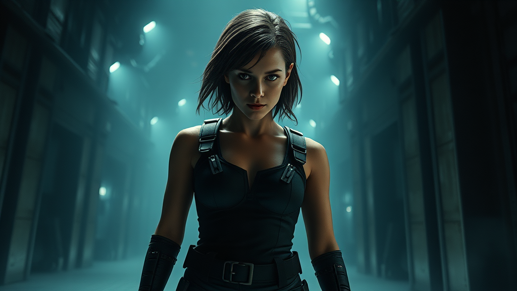Epic cinematic wallpaper showcasing Ellen Ripley in a highly detailed, ultra-realistic 8k render. Captured in a dynamic, intense pose, Ripley stands ready for action in her iconic outfit, surrounded by a futuristic, industrial backdrop with intricate textures. The scene is illuminated with dramatic, moody lighting casting deep shadows, highlighting her determined expression. A subtle haze adds depth, enhancing the atmospheric tension and sci-fi ambiance, making it a stunning visual experience.