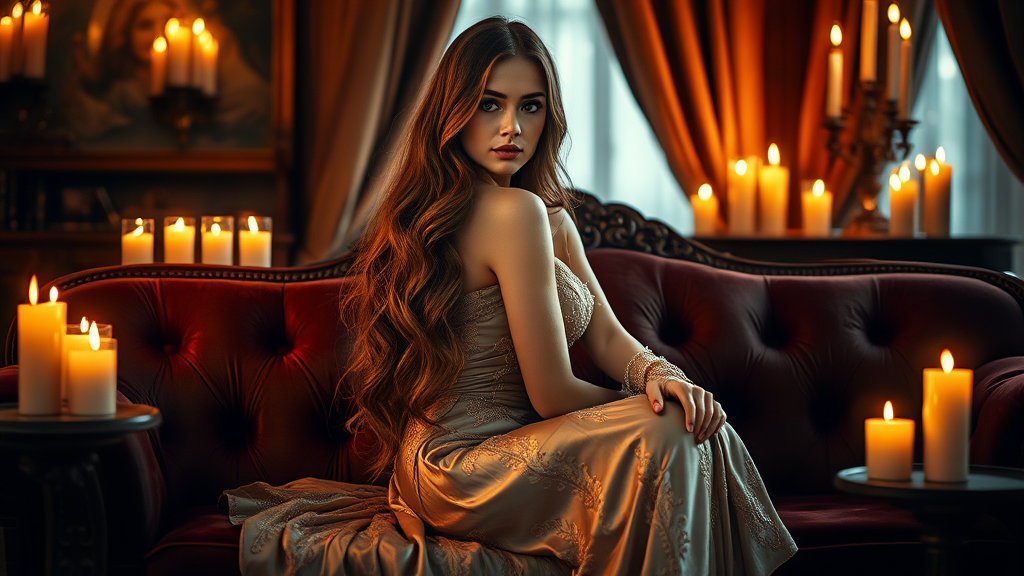 Epic composition portrait of a beautiful woman sitting gracefully on a velvet couch in a softly illuminated room filled with the warm glow of flickering candles. Her long, luxurious hair cascades down her back in gentle, flowing waves. She is adorned in an intricate silk gown, the delicate fabric shimmering subtly in the candlelight, enhancing the serene and enchanting atmosphere of the scene.