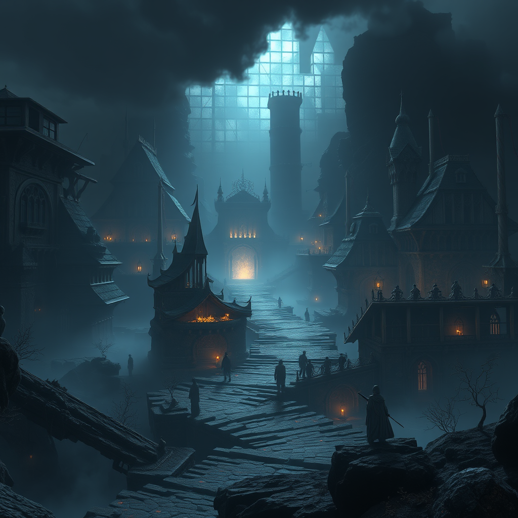 Epic dark fantasy scene with intricate details and immersive atmosphere, featuring realistic volumetric lighting that bathes the landscape in a mysterious glow, capturing the essence of a mystical realm. Rendered in Full HD and 8K resolution, the scene showcases a blend of high fantasy and dark elements, akin to a concept art masterpiece that could be created with the power of Unreal engine. Set in a world trending on Artstation, the environment is filled with rich textures and a sense of depth, as if stepping into a hauntingly beautiful painting that tells a story of forgotten magic and ancient secrets.