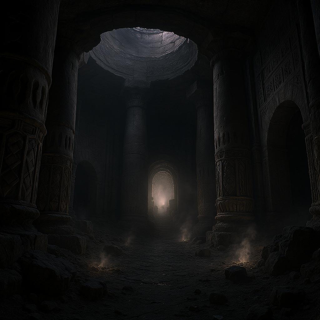 Epic detailed photograph of the legendary Mines of Moria, captured through a brutalist dark fantasy lens, showcasing colossal stone columns, shadowy archways, and an ethereal glow illuminating intricate carvings.
