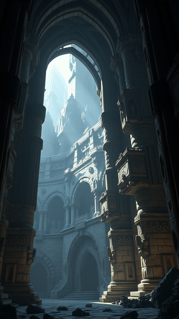 Epic detailed photograph of the majestic Mines of Moria, showcasing a fusion of brutalist architecture and dark fantasy elements; towering stone columns and intricate carvings cast deep shadows, creating an atmosphere of eerie grandeur and mystery.