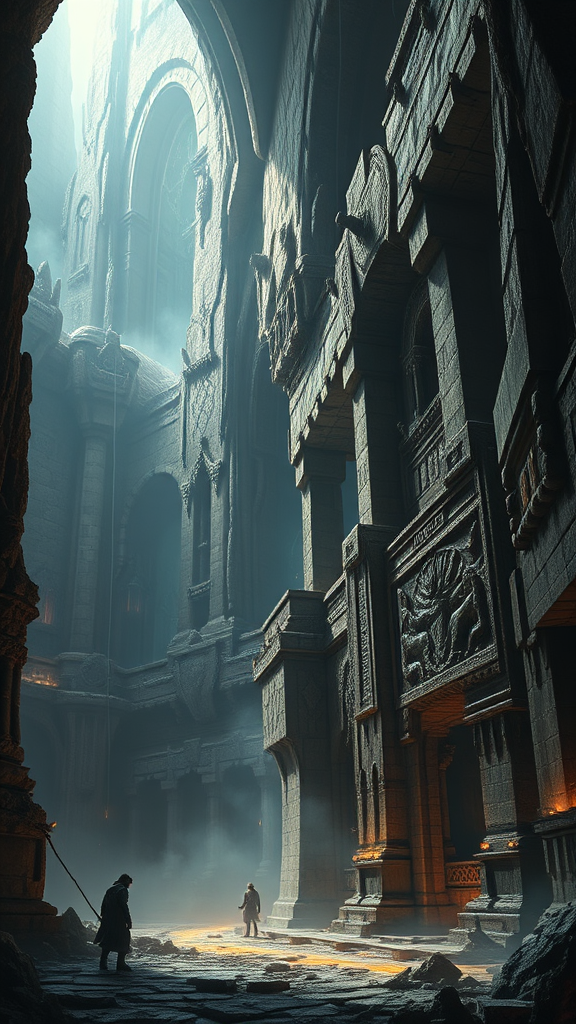 Epic detailed scene of a colossal subterranean kingdom resembling the Mines of Moria, infused with brutalist architecture and dark fantasy elements; towering stone pillars and arches, shadows cast by glowing crystal formations, intricate carvings on the walls depicting ancient legends, an eerie mist hovering above the ground, and an atmosphere of looming mystery and ancient power.