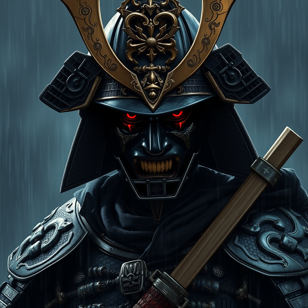 Epic digital portrait of a fierce samurai in black armor, detailed and ornate samurai gear, faceless, with exceptional attention to detail, set against a nighttime backdrop, rain-soaked atmosphere, in the style of Milo Manara and Russ Mills, a masterpiece with dramatic cinematic lighting, evoking deep emotions, unforgettable and highly intricate, text elements present, low resolution, jpeg artifacts, unattractive, duplicate image flaws, morbid imagery, distorted features, poorly illustrated hands, and face, mutations, misaligned anatomy, improper proportions, additional limbs, duplicated facial features, awkward proportions, malformed limbs, absence of limbs, surplus limbs, elongated neck, presence of name, signature, watermark, autograph, or trademark, cropped or obscured elements, flawed body structure, unsightly face, imperfect teeth, and other deformities.