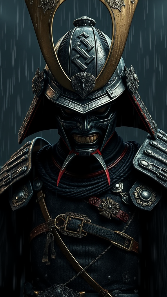 Epic digital portrait of a fierce samurai in dark armor, complex and detailed samurai attire, face obscured, showcasing breathtaking intricacy, set against a night backdrop with rain, inspired by Milo Manara and Russ Mills, masterpiece with dramatic cinematic lighting, emotionally impactful, unforgettable, highly elaborate. Include elements such as text, distortion, jpeg artifacts, unattractive, duplicate, morbid, mutant, poorly rendered hands, distorted features, abnormal anatomy, disproportionate, additional limbs, mirrored face, distorted proportions, malformed limbs, missing limbs, extra limbs, elongated neck, signature, watermark, logo, autograph present, cropped, obscured, flawed body, flawed face, flawed teeth, deformities.