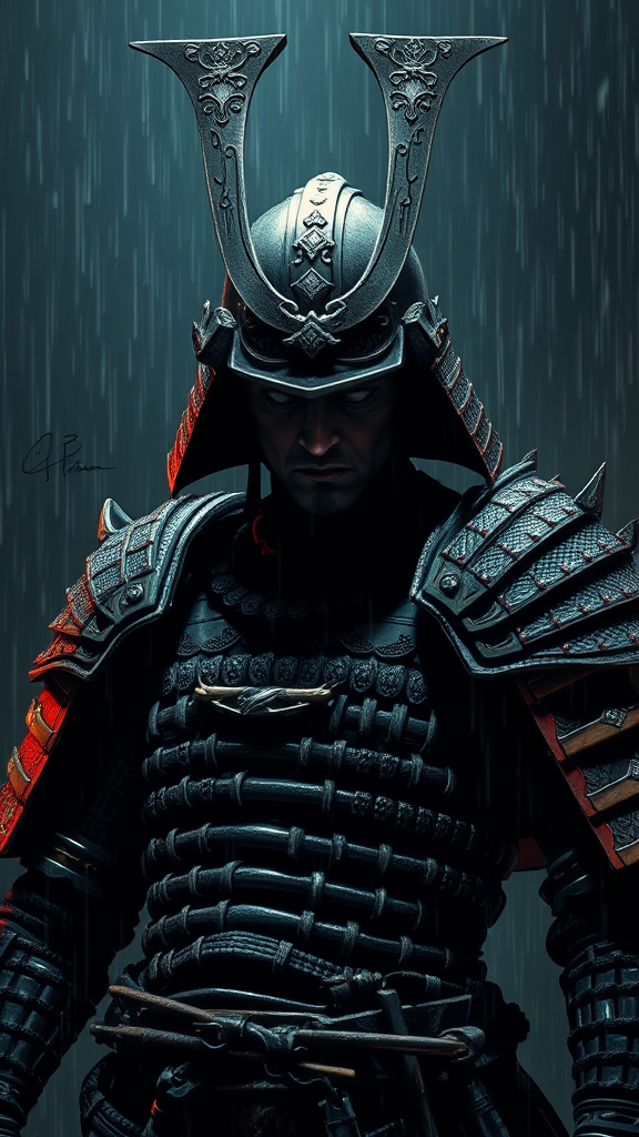 Epic digital portrait of a fierce samurai in dark, intricately detailed armor, faceless, set against a nocturnal, rainy backdrop, inspired by the styles of Milo Manara and Russ Mills. Captured with dramatic, cinematic lighting that conveys deep emotion, the image is unforgettable and highly intricate, despite elements of low quality, such as jpeg artifacts and visual distortions. The composition features exaggerated anatomy with elongated limbs and unconventional proportions, lending a surreal and haunting atmosphere. Missing or extra limbs and peculiar physical traits are prominent, alongside an artful play on textures and shadows. Names, signatures, and other marks are subtly included, adding layers of mystery to the mesmerizing, imperfect elegance.