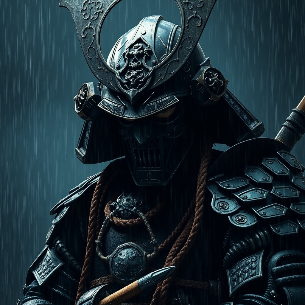 Epic digital portrait of a fierce samurai in obsidian armor, with elaborate and detailed samurai gear, faceless, set in a nighttime downpour. Inspired by the styles of Milo Manara and Russ Mills, this masterpiece features dramatic cinematic lighting and delivers an emotionally profound, unforgettable impact. The intricate design captures the essence of a samurai, though it is portrayed with imperfections such as distorted anatomy and exaggerated forms, evoking a sense of mutation and transformation. The figure may have elongated limbs or duplicated features, adding to the surreal and haunting atmosphere. The background and details are intentionally flawed as if affected by low quality and visual artifacts. The composition includes unsettling elements like morbid details and deformed proportions, creating a captivating yet grotesque visual experience.