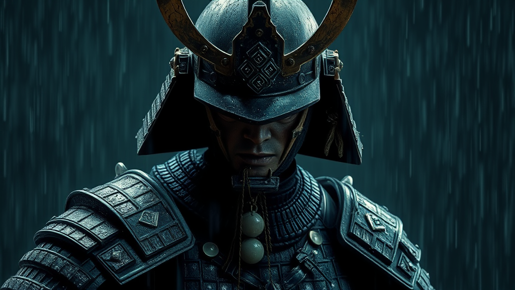 Epic digital portrait of a fierce samurai in weathered black armor, intricately detailed, face obscured, set in a rain-soaked night scene, by Milo Manara and Russ Mills. A masterpiece with dramatic cinematic lighting, conveying deep emotion and leaving a lasting impression. The scene is very detailed, evoking a powerful atmosphere. Imperfect texture with low-quality artifacts adds to its gritty charm. The anatomy is surreal, with abstract proportions and elongated features. Limbs might appear duplicated or misplaced, enhancing its haunting allure. The scene bears a sense of distortion, with elongated necks, ambiguous forms, and mysterious shadows, alluding to a sense of anonymity and fluid identity. Signs of artistic imperfection like cut-off elements or faint outlines of signatures and watermarks contribute to its avant-garde style.