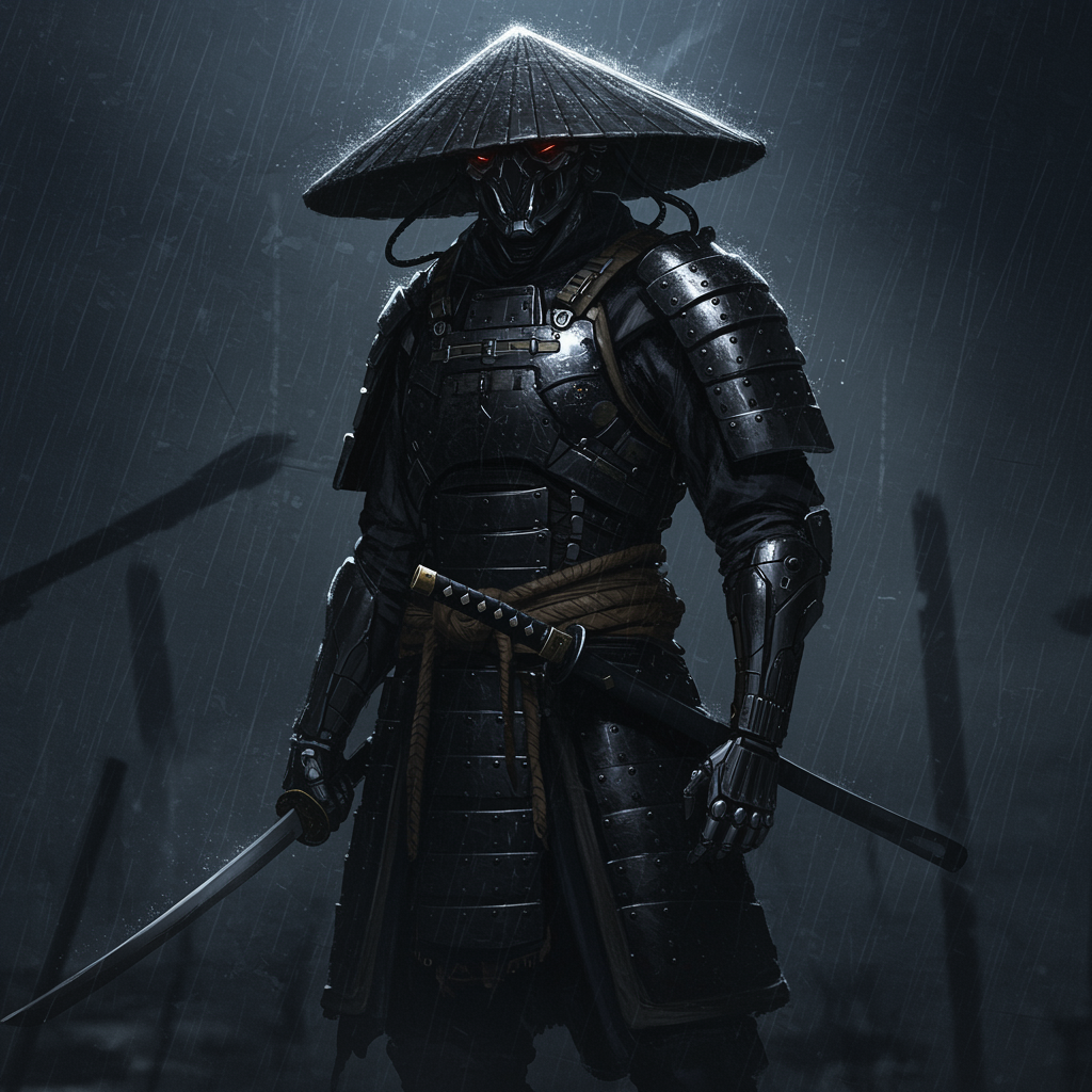 Epic digital wallpaper of a lone, proud cyborg samurai in black tech armor, set against a rainy night backdrop. Featuring intricate armor with no visible face, the scene captures a dramatic, emotionally profound atmosphere. The art style blends the influences of Milo Manara and Russ Mills, with dramatic lighting enhancing the somber mood. The composition presents the samurai in a heroic pose, exuding confidence and unforgettable presence. Despite the dark and rainy setting, the image maintains clarity with no digital imperfections, ensuring both anatomy and proportions are accurate. Elements like extra limbs, malformed features, or any digital artifacts are absent, preserving a clean and seamless appearance.