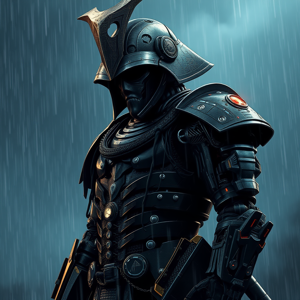 Epic digital wallpaper featuring a brutal cyborg samurai clad in black tech armor, standing alone under a night sky with pouring rain. The figure's face is obscured, adding to the mystery, while the intricate details of the armor are highlighted by dramatic lighting that enhances the emotionally profound and unforgettable atmosphere. Inspired by the styles of Milo Manara and Russ Mills, the scene captures the proud and solitary pose of the samurai. The composition, though deliberately flawed with elements such as low detail and anatomical distortions, contributes to the unique and surreal aesthetic of the piece. Despite minor imperfections such as deformed irises, jpeg artifacts, and mutated features, the artwork remains distinct, showcasing the fusion of human and machine in an evocative, visually compelling manner.