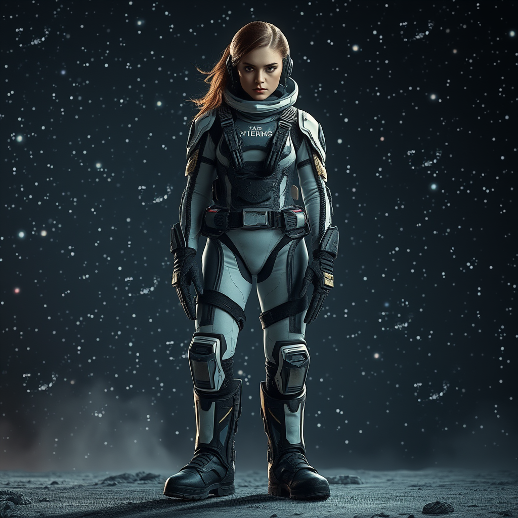 Epic fantasy: A female X-wing pilot stands confidently in an advanced space suit, complete with durable boots designed for interstellar combat. The suit exhibits sleek and futuristic technology, adorned with intricate details that highlight its warcore style. A cinematic lighting casts dramatic shadows across her resolute face, emphasizing her harsh yet determined expression. The scene exudes hyper-realism with a grainy texture capturing the raw intensity of her character design. Her presence is commanding, set against the backdrop of a star-filled galaxy, immersing you in a world where technology and epic fantasy collide, captured in stunning detail at 8k resolution.