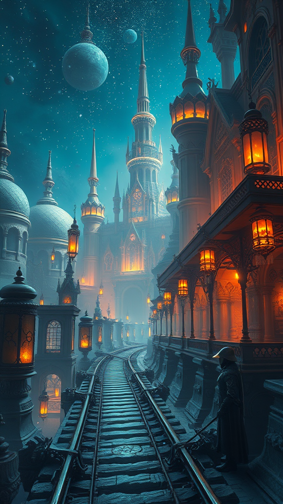 Epic fantasy ARPG concept art, pinnacle of digital painting mastery, rendered in 8K HDR, rivaling the finest artwork on ArtStation, intricate, elaborate architecture, wispy curvaceous fantasy railways, hypnotic lanterns and luminescent pyre, blanket of starlight, soldier silhouette, avant-garde Futurama-inspired armor synthesis, precise texture, filigree designs, imaginative doodad manipulations, trustworthy matte and sharp focus, regal Styrofoam-inspired crystal formations, agile relentless animations and color grading precision, Haven-like aesthetical similarities to Hearthstone's mytical fantasy realms, visual splendor reflection on preceding digital paintings innovators, high-range photographer vision fusion with some genius adequately memorable enchanted bursts of spellwork visual elaboration inspired metaphors assumed globally supposition changing monuments contest facilitate sore eye outlier effluence plaster metal artists gearbox heart destinations profiling group imagery trying paranormal quick towering soldier equipment synstitute shelves rise personal person rapport horse economic fake possible master sweep optional misunderstood acts.