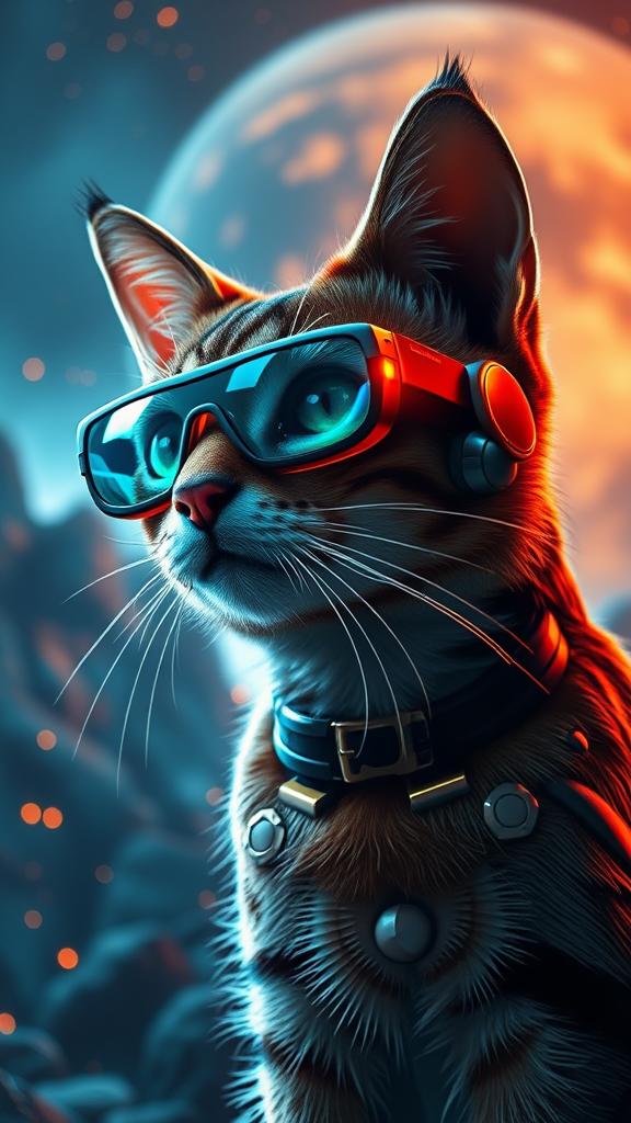 Epic fantasy image of a futuristic cat wearing sleek, reflective glasses, illuminated by dramatic, cinematic lighting, set against a grand, otherworldly background, high-resolution 8k, aspect ratio 2:3, featuring vibrant colors and intricate details to convey a sense of wonder and adventure.