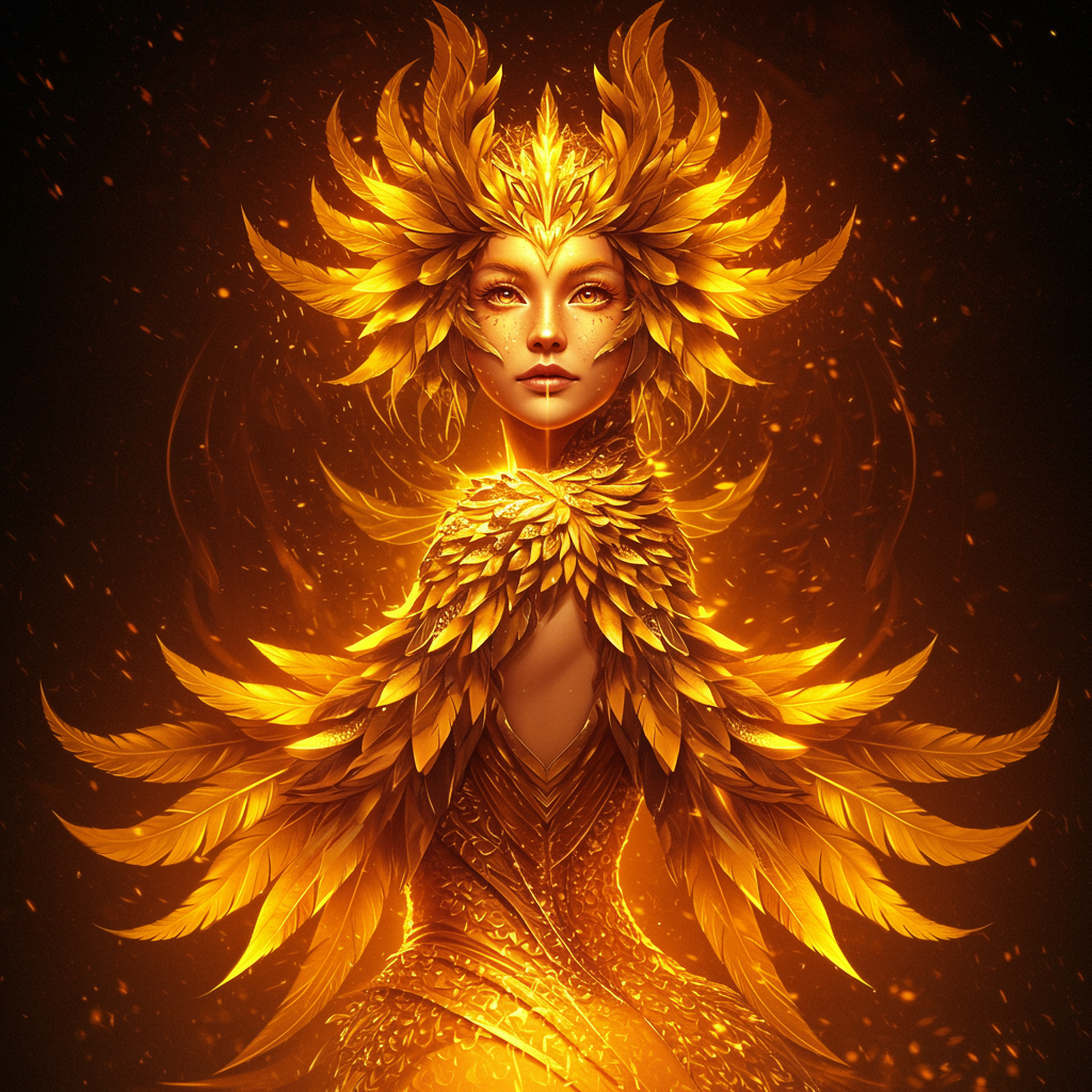 Epic full-body portrait of a stunning Firebird girl with a mesmerizing blend of gold and fire, illuminated by acid lighting from beneath. She possesses an enigmatic, playful smile and inquisitive eyes that reflect an intricate world, surrounded by fractal hair and feathers. Her face is hyperdetailed and beautifully crafted, exuding an air of mystery. Her complex outfit resembles a chaotic array of diamonds, drawing inspiration from art deco with surreal, fractal details. Captured in a view from the back, her posture suggests graceful movement. The artwork embodies a hyper-realistic style inspired by influential artists like Bayard Wu, Ognjen Sporin, and Viktor Miller-Gausa, showcasing detailed ornamentation and intricate patterns in warm gold hues.