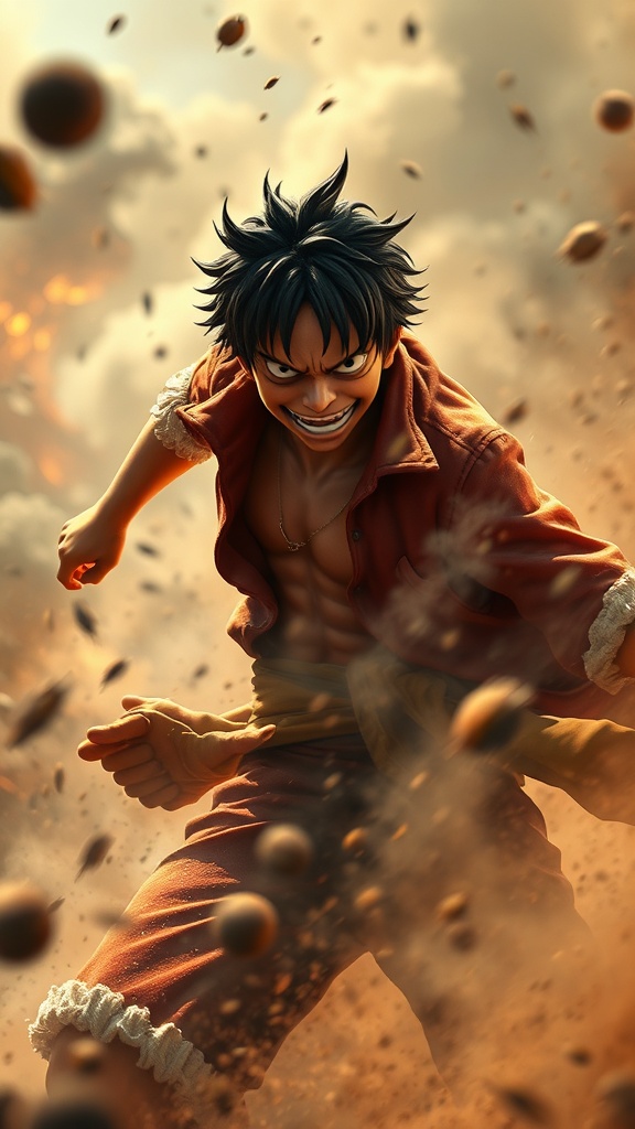 Epic hyper-realistic character design of Luffy in the midst of a fierce battle, engulfed in swirling mist and chaos, rendered with photorealistic precision using octane render and unreal engine 5, the scene rendered in 8k with meticulous attention to detail, enhanced by hyper detailed textures and volumetric lighting that casts dramatic shadows, HDR capturing the riotous energy, turmoil and conflict of the battlefield, the intensity of combat reflected in Luffy's determined expression and dynamic pose, minor creative twists add to the vibrancy of the scene while respecting its core concept.