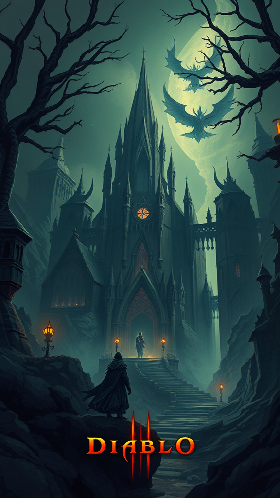 Epic illustration, cartoon style with dark, soothing tones, featuring a mystical scene inspired by Diablo 4, blending realism and fantasy elements in an atmospheric setting filled with intricate details and dramatic lighting.