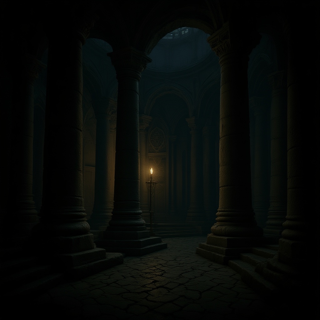 Epic intricate caverns of an ancient dwarven city, brutalist dark fantasy atmosphere, colossal stone columns, dimly lit with ethereal glow, mysterious shadows and hidden depths, echoes of forgotten legends and myth, a labyrinth of majestic halls and passageways.