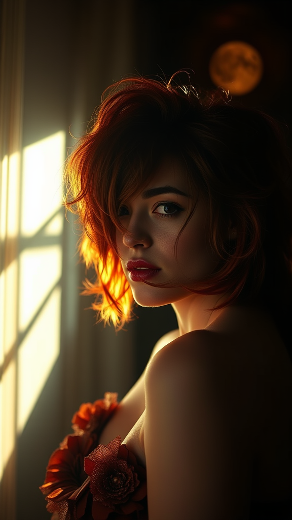 Epic photograph capturing the interplay of sun rays and moonlit ambiance, utilizing a DSLR with a zoom lens. The scene features a woman with a striking red lush hairstyle and less conventional features, posed in a studio setting with dramatic lighting techniques like Rembrandt and loop lighting. A range of film aesthetics from Kodak Portra 800 to Fuji Superia 400 add texture, supported by selective focus and a depth of field dynamically shifting between 270mm and 100mm. The setup is illuminated with a Canon 5D Mark IV and complemented by the vivid clarity of a Phase One XF IQ4 150MP. The artistic atmosphere is further enriched with lens flare effects, emerging from a mix of telephoto and wide-angle perspectives. Despite the diverse technical elements at play, the image remains free of visual imperfections like low resolution or digital artifacts, focusing on a sense of haunting beauty and intricate details.
