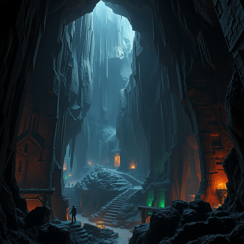Epic photograph capturing the vast intricate caverns of a mythical underground realm, blending brutalist architecture with dark fantasy elements, featuring towering stone pillars, shadowy passageways, and ethereal glows from hidden veins of mystical minerals.